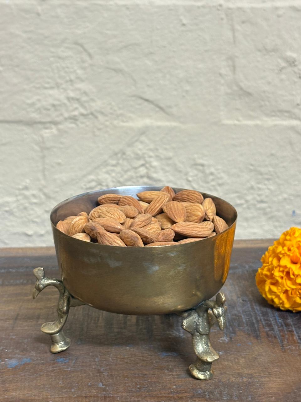 A round, brass bowl uniquely supported by ornate legs shaped like peacock, giving it a traditional or handcrafted aesthetic.
