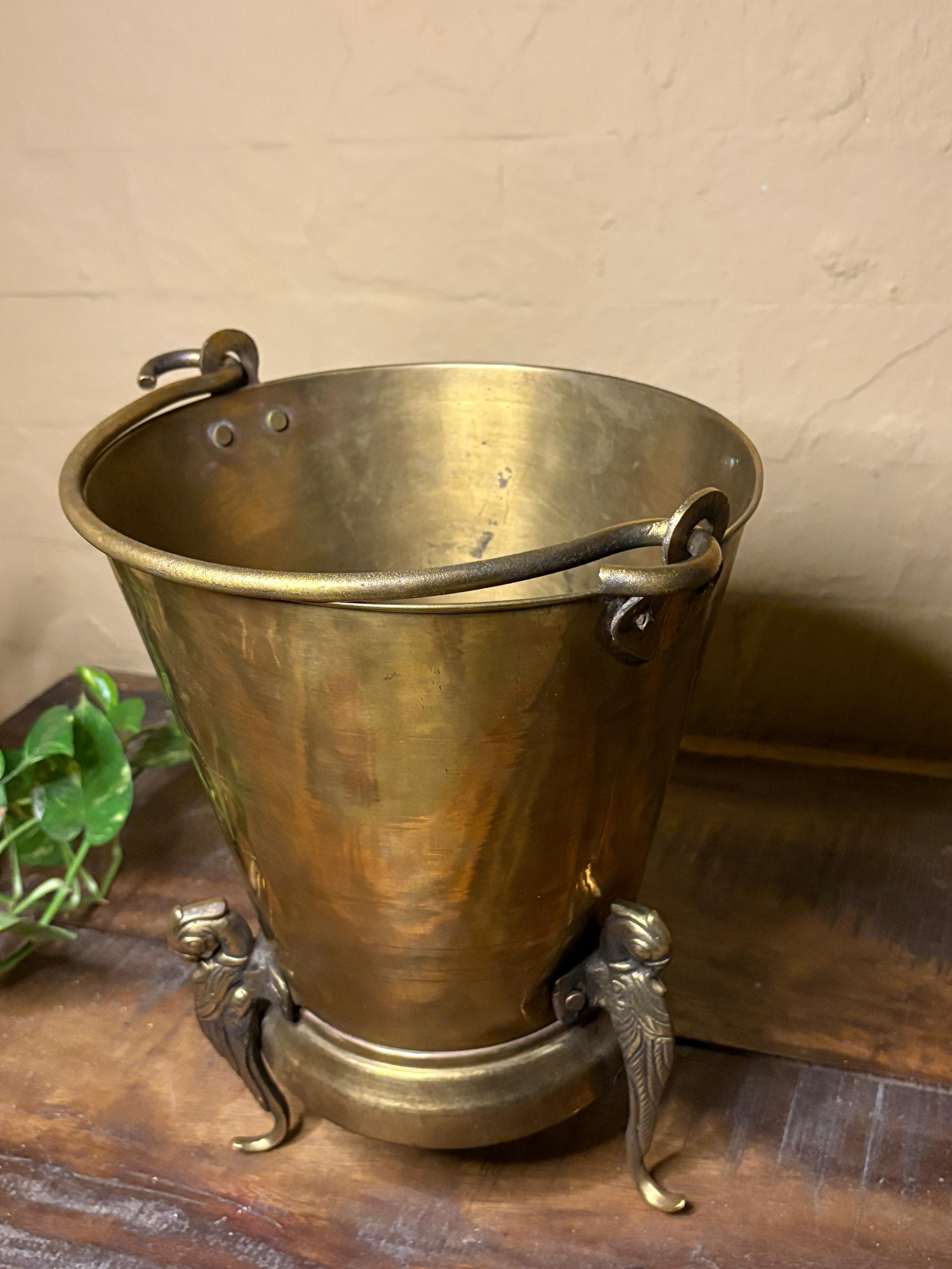 Large antique brass bucket with a rich patina. Perfect for holding larger plants, firewood, or as a grand decorative statement.