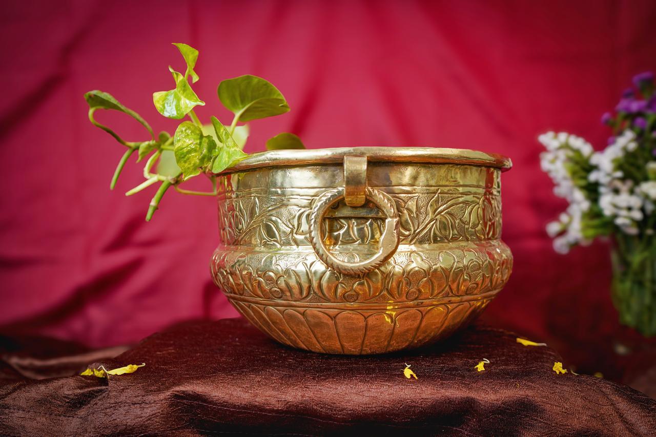 Traditional wide-mouthed brass Urli. Perfect for floating flowers or candles for festive decoration.